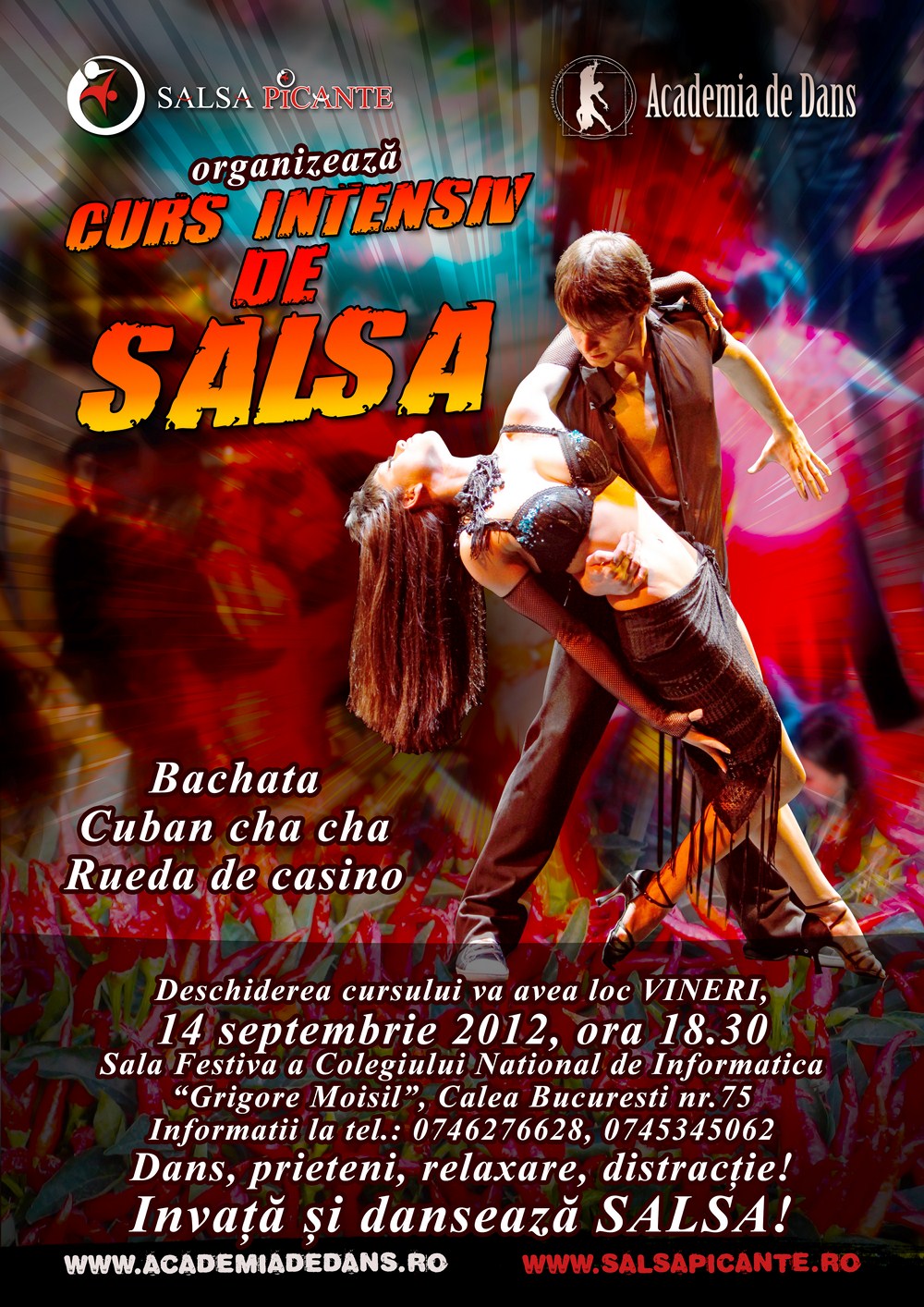 Salsa Picante si Academia de Dans va asteapta la un nou curs intensiv de SALSA! Deschiderea va avea loc vineri, 14 septembrie 2012, ora 18.30 in Sala Festiva a Colegiului National de Informatica Grigore Moisil, Calea Bucuresti nr.75.